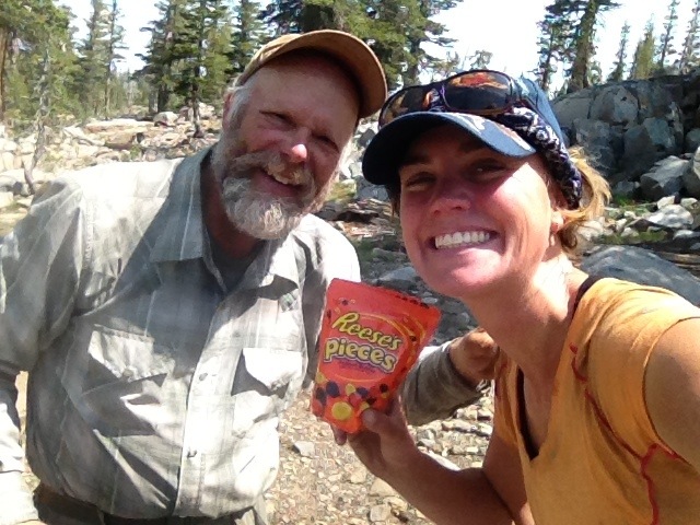 Six miles down the trail I saw the stones that signified 1000 trail miles on the PCT. I shouted with joy even though I was on my own, and when I discovered this part of the trail was free of mosquitos, I decided to set up some trail magic and wait for some other hikers to come through. The trail magic consisted of a big bag of Reece’s Pieces and gummy bears I’d been carrying since Mammoth. The first hiker to roll through was Fuller. He was ecstatic to receive chocolate on arrival and have someone to take his picture. In return he offered me a shot of Crown Royal and took my picture. Moonshine and Leaky arrived next, followed by Sexy Legs, Verde, Delaware Dave and Skip. It was so much more enjoyable to celebrate the milestone with others!