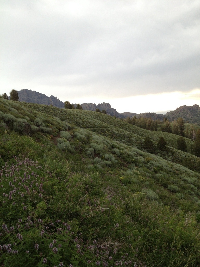 As I was about to make myself a very late lunch the thunder started getting louder and the rain started coming down. I went to lower ground after an older hiker Otter came back down the trail for shelter. Once I’d eaten I hit the trail again in the rain. Jug passed me again too and said the lightning was at least 9 miles away – far enough for me. I must have left lunch until too late because I became so tired I almost considered taking a nap at 5pm. I still had four miles to go to the campsite I was aiming for but I simply had no energy. I ate a couple of bars and stripped off my rain gear which was too hot, then gave it my all to make it those last few miles. The scenery was exquisite, I felt like I was walking through a scene in Shrek with wild flowers, rolling hills and jagged peaks in the background.