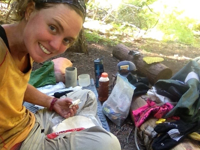Then my back started to ache. It’s the same spot I had Igor my back specialist in Vancouver work on before I left for the trip. It’s a niggling pain that sometimes extends all the way through my buttocks and into my leg. I rubbed some of Dr Soles magic green potion on it, stretched and took some pain killers. This helped me make the next 5 miles where I could take a real break, do some serious stretching and some self-massage. There was a beautiful shady spot right next to Deer Creek where I exploded my pack and ate lunch after rinsing off in the water. It felt so good to clean my feet as I’ve got a nasty blister between my big and second toe on my right foot and a blister just under the heel on both feet. These ones hurt!