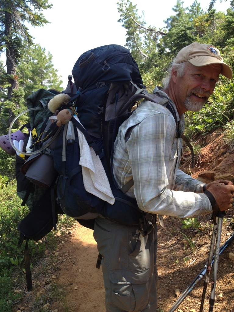 No more than 5 minutes later Fuller and Daniel came around the bend and Fuller sat down on the trail next to me to discuss options. He came up with a solution he figured would be absolutely full proof, preventing any weight from my pack aggravating the nerve causing the pain. He would carry my pack! Of course I told him this was the most absurd idea I’d ever heard but I entertained his insistence because I really had no other choice. Once he’d strapped my pack to his I helped him heave it onto his back, and although he insisted it wasn’t heavy I made him take it straight off (after fits of laughter and a photo naturally!)